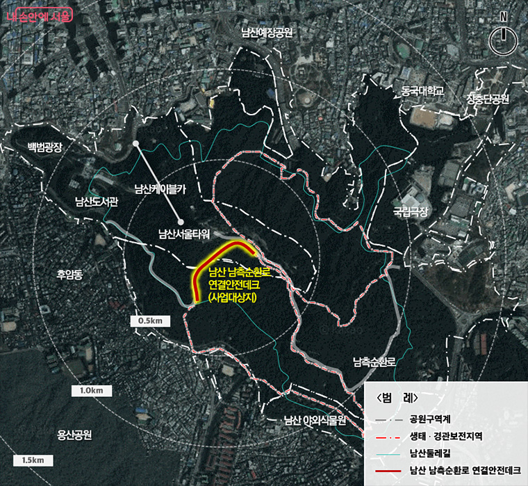 서울시는 6월 4일부터 남산 남측순환로 팔각안내센터와 체력단련장을 잇는 460m 길이의 ‘연결안전데크’를 개방했습니다. ‘남산 생태는 보전하고, 시민들의 안전한 보행’을 핵심으로 한 숲속 자연 친화적 산책데크와 차량·자전거도로와 분리된 보행자 전용데크 등으로 나눠집니다.
