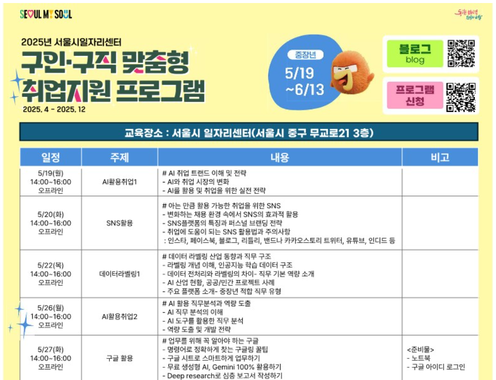 서울시가 첫 취업 준비로 막막한 '청년'부터 새로운 직업에 도전하기 어려운 '시니어'까지, 모든 연령층에 맞춤형 취업지원 프로그램을 제공합니다. 지금 구직 중이라면, 나에게 꼭 맞춘 직무특강과 자격증 교육 등 다양한 지원을 무료로 알차게 받아보세요!