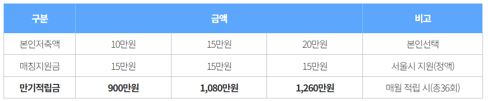 ▴저축액이 10만 원일 경우 만기 적립금 900만 원(본인 저축액 360만 원+매칭 지원금 540만 원), ▴15만 원일 경우 1,080만 원(본인 저축액 540만 원+매칭 지원금 540만 원), ▴20만 원일 경우 1,260만 원(본인 저축액 720만 원+매칭 지원금 540만 원)과 이자를 받을 수 있습니다.